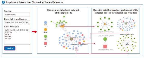 交互式调控网络:用户输入一个基因、转录因子或SE的标识符,工具即可在人类或小鼠中构建一个一阶邻居交互网络。该网络以图形化方式动态展示查询实体与相关联的增强子、SE和TF之间的连接。点击网络中任一节点,可实时展开其直接互作对象,支持用户深入探索调控子网络,所有数据均可导出。