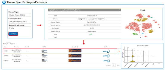 肿瘤特异性SE检测器:该工具专为癌症研究设计,整合了来自12种癌症类型及其正常对照的scRNA-seq数据,涵盖超40万个单细胞。利用Seurat和Harmony进行细胞聚类与批次效应校正,通过SingleR进行细胞类型注释,最终通过比对细胞类型特异性标记基因与已知SE相关基因集,来锁定肿瘤内特定细胞亚群(如癌细胞、免疫细胞)特有的SE,并通过t-SNE/UMAP图和小提琴图进行可视化。