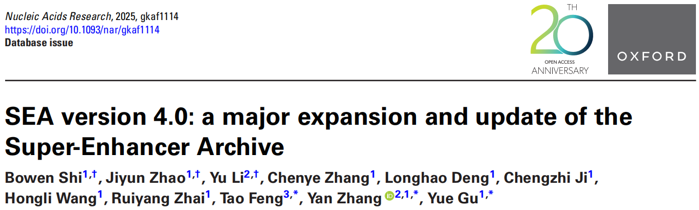 2025年10月31日,来自哈尔滨工业大学顾悦/张岩/的团队在《Nucleic Acids Research》上发表文章“SEA version 4.0: a major expansion and update of the Super-Enhancer Archive”,推出了更新的SEA 4.0版本,这是一个用于系统性搜索、注释、分析和可视化SE的综合交互式平台。该平台覆盖14个物种、54万+细胞类型、近50万个SE,是解码SE在发育和疾病中机制作用的不可或缺的资源。