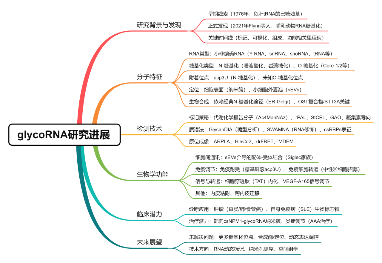 以上就是近些年glycoRNA研究领域发表的一些顶刊成果。最后,围绕复旦大学粤港澳大湾区精准医学研究院(广州)谢一轩课题组最新发表的综述文章[2],再概括下glycoRNA的研究进展: