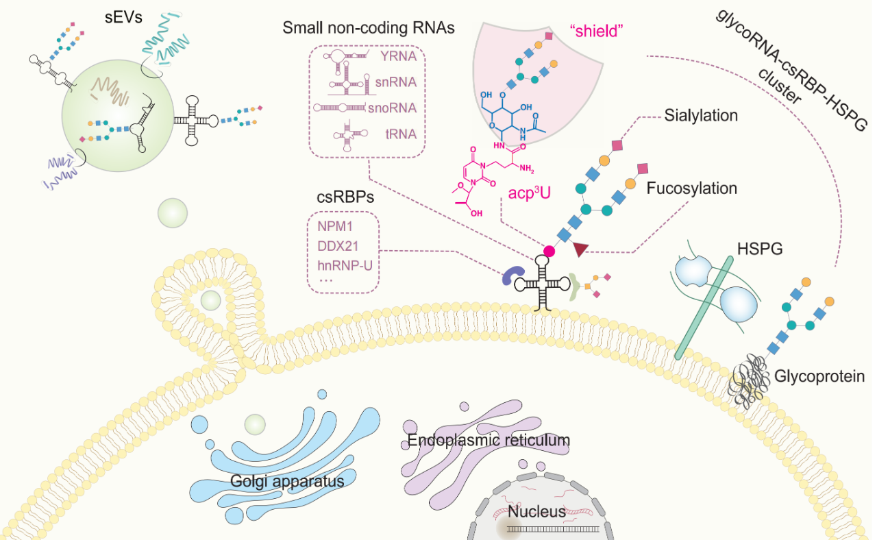 与此同时,RNA作为遗传信息的传递者,虽然拥有m6A、m5C等超过170种化学修饰来调控自身的稳定性或翻译效率,但长期以来,科学界普遍认为RNA与糖基化是绝缘的。原因很简单:空间隔离。RNA主要存在于细胞核和细胞质中,而糖基化过程发生于内质网和高尔基体,最终展示在细胞表面。两者看似毫无交集。然而,2021年,cell一篇突破性研究打破了这一成见。