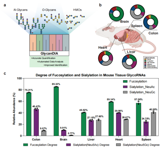 为解决低丰度糖链的分析难题,研究开发了DIA流程——GlycanDIA。该方法结合优化的碎片离子库,能够高灵敏度、高精度地鉴定和定量N-聚糖、O-聚糖及人乳低聚糖,揭示了RNA上的糖链结构具有不同于蛋白糖修饰的特征(如高甘露糖型或特定的唾液酸/岩藻糖比例)[14]。