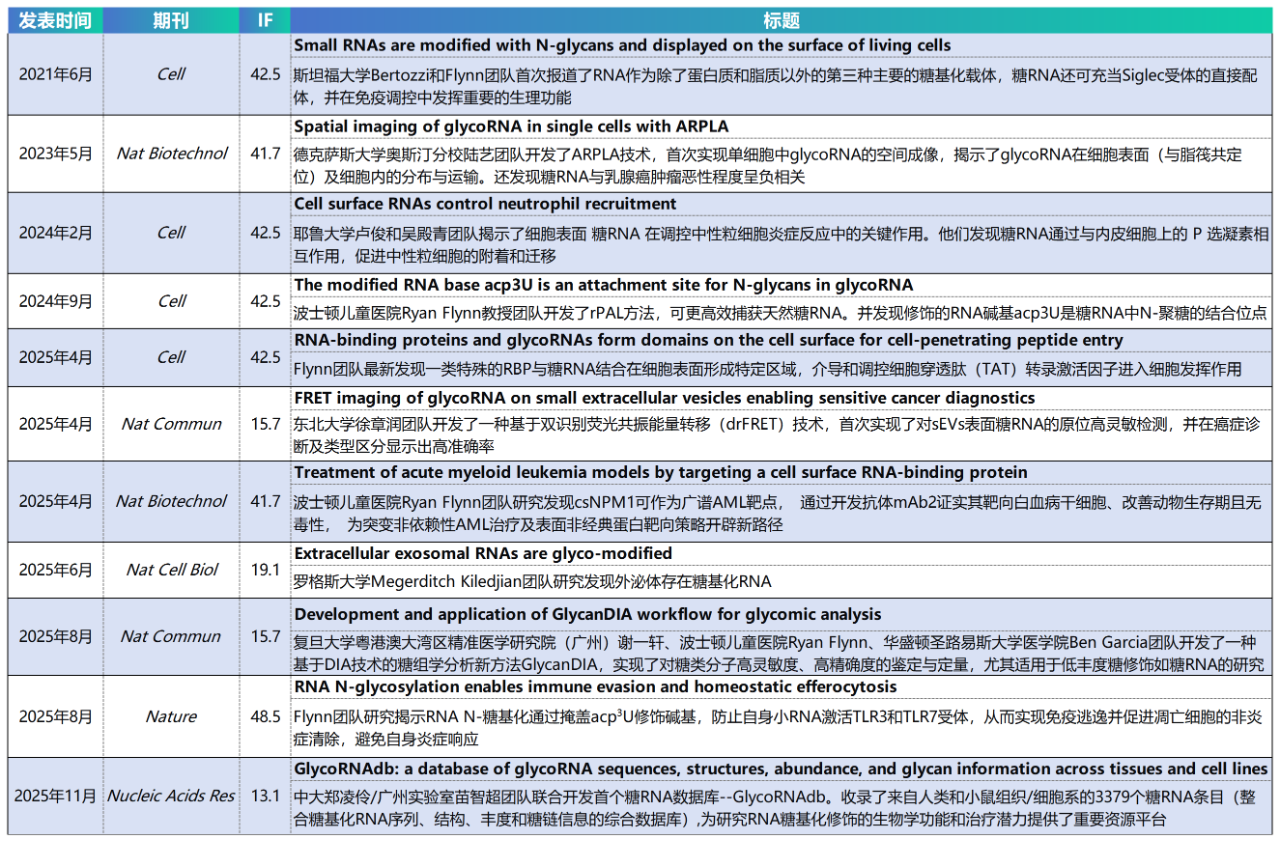 近几年来,glycoRNA作为新兴研究领域,陆续取得一些突破性进展,其中不乏顶刊文章,下面我们来盘点下都产出了哪些顶刊成果: