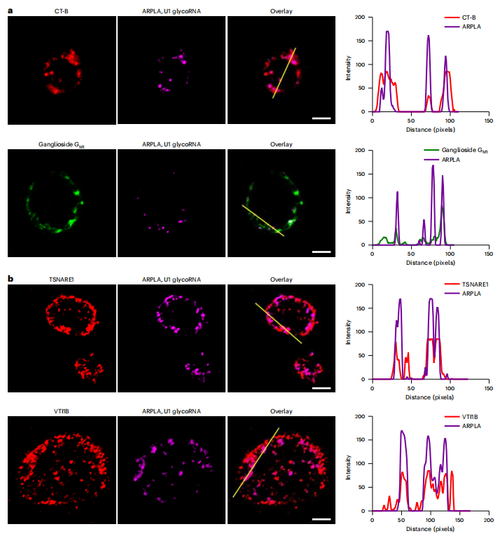 利用ARPLA,研究人员首次清晰地观察到glycoRNA富集在细胞膜表面的脂筏(Lipid rafts)区域,并揭示了其通过SNARE蛋白介导的胞吐途径运输到细胞表面的过程。