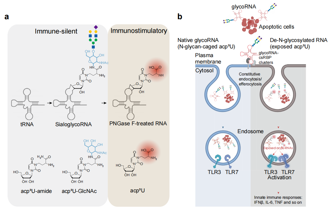 N-糖基化的glycoRNA通过掩盖免疫刺激性修饰碱基acp3U,防止内源性小RNA被先天免疫系统误识别为外来分子,从而在细胞稳态和凋亡细胞清除(胞葬)过程中避免有害的自身免疫反应。