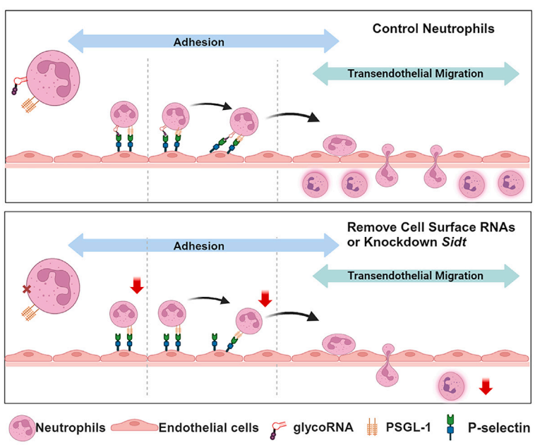 中性粒细胞通过其表面展示的glycoRNA,作为配体与血管内皮细胞上的P-选择素结合,从而介导中性粒细胞在炎症初期对血管壁的捕获和滚动,这是其成功招募到炎症部位的关键步骤。该过程依赖于Sidt家族蛋白介导的RNA转运。