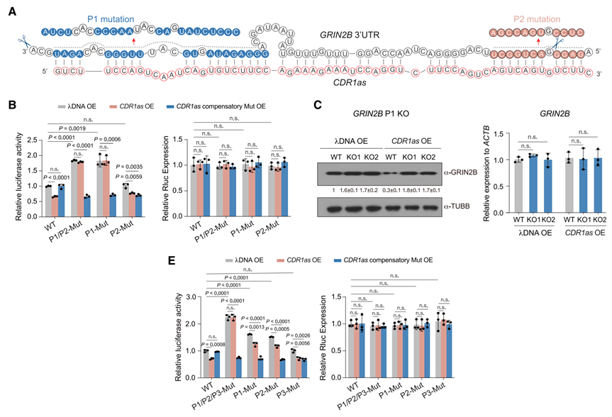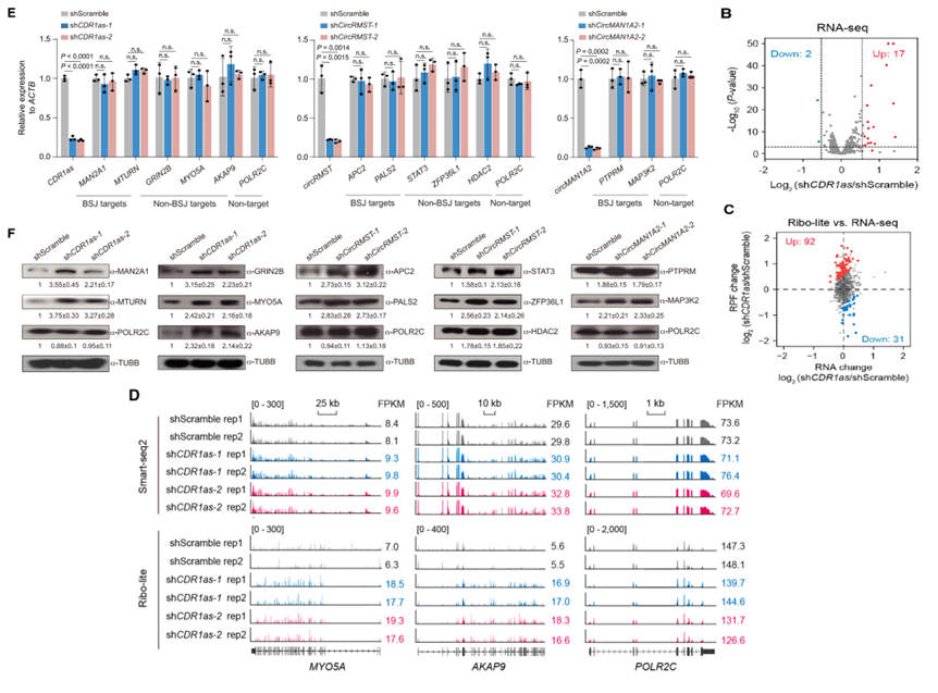 为探究circRNA对靶标RNA的调控功能,研究结合了shRNA敲低、RNA-seq和Ribo-seq(核糖体印迹测序)技术。结果显示,在hNPC来源的神经元中敲低CDR1as、circRMST或circMAN1A2后,其靶标mRNA的转录水平未发生显著变化,但靶标蛋白水平显著上升。全基因组分析进一步证实,CDR1as敲低导致其靶标基因的翻译效率特异性增加,而mRNA丰度保持稳定,表明circRNA主要通过抑制翻译而非促进降解来调控靶标基因表达。