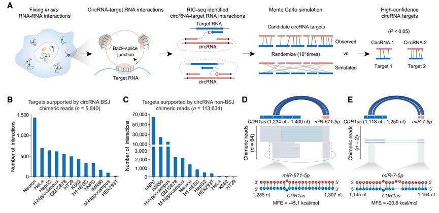 研究团队首先开发了名为circTargetMap的计算分析流程,旨在从RIC-seq数据中系统性鉴定circRNA与其他RNA的相互作用。该策略通过识别跨越circRNA反向剪接位点以及全长序列的嵌合体reads,并结合蒙特卡洛模拟去除背景噪声,成功在10种人类细胞系及海马组织中绘制了高分辨率的互作图谱。分析共鉴定出117,163个高置信度互作,发现绝大多数靶标mRNA被多个circRNA结合,揭示了circRNA广泛的靶向能力。此外,该方法精准重现了CDR1as与miR-7及miR-671的已知互作,验证了策略的可靠性。