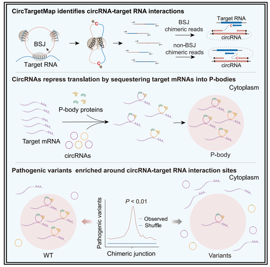 2026年02月16日,中国科学院生物物理研究所薛愿超研究员团队在《Molecular Cell》上发表了题为“Global mapping of circRNA-target RNA interactions reveal P-body-mediated translational repression”的重要研究。该研究开发了一套全新的计算分析流程circTargetMap,利用RIC-seq数据构建了转录组范围内的circRNA-靶标RNA互作图谱。研究团队在多个细胞系和海马组织中鉴定了超过11万个高置信度互作,发现绝大多数靶标mRNA被多个circRNA结合。功能上,研究揭示了CDR1as和circRMST等circRNA通过序列特异性的碱基互补配对,将靶标mRNA隔离至P-body(Processing bodies)中从而抑制其翻译,该过程不依赖于miRNA或AGO2/DICER途径。为进一步验证,团队开发了GRIC-seq技术直接捕获颗粒内的RNA互作,证实了这是一种普遍存在的P-body介导的翻译抑制机制。此外,研究还发现致病性变异显著富集在circRNA与靶标RNA的结合位点,提示该机制在疾病发生中的潜在作用。