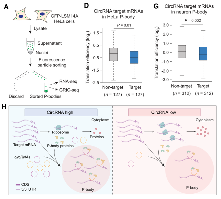 为了直接捕获无膜细胞器内的RNA互作,研究开发了GRIC-seq(Granule RIC-seq)技术。通过FAPS流式分选或免疫沉淀纯化P-body,并在其内部进行原位邻近连接和测序,研究团队绘制了P-body特异性的RNA互作图谱。数据表明,P-body内部富集了数千种circRNA及其靶标mRNA。与非靶标对照相比,这些被circRNA招募至P-body的mRNA在全转录组水平上表现出显著更低的翻译效率,证实了这是一种普遍存在的基因表达调控模式。