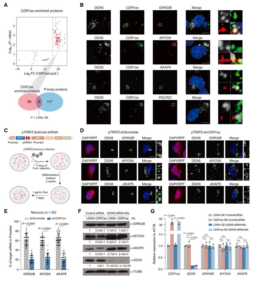 为解析翻译抑制的亚细胞空间机制,研究团队利用ChIRP-MS技术鉴定了CDR1as的结合蛋白,发现其显著富集P-body(加工小体)的核心组分。IF/smFISH(高分辨率成像)显示,CDR1as与靶标mRNA在神经元胞质中与P-body标记物DDX6高度共定位。功能缺失实验表明,敲低CDR1as导致靶标mRNA脱离P-body,而破坏P-body核心蛋白则完全阻断了circRNA介导的翻译抑制。这表明circRNA起到了“分子穿梭机”的作用,将靶标mRNA隔离至P-body中以阻止核糖体装载。