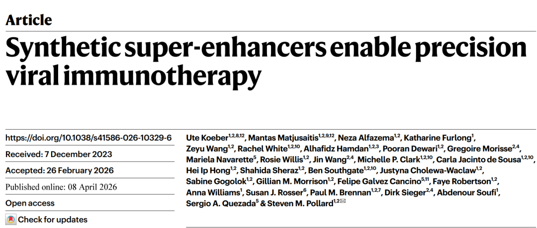 Koeber U, Matjusaitis M, Alfazema N, et al. Synthetic super-enhancers enable precision viral immunotherapy. Nature. Published online April 8, 2026. doi:10.1038/s41586-026-10329-6