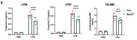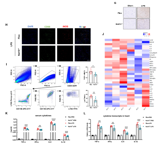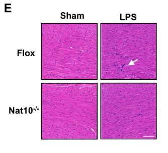 研究最后在LPS诱导的ETM小鼠模型中验证了NAT10的病理生理意义。实验结果显示,LPS攻击后,小鼠心脏组织中浸润的巨噬细胞内NAT10和Ets2的蛋白表达水平均显著上调。