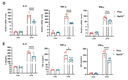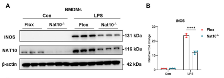 为了明确NAT10在巨噬细胞炎症反应中的具体功能,研究人员构建了髓系特异性Nat10敲除小鼠(Nat10-/-),并分离BMDMs进行体外实验。Western Blot和qPCR结果显示,与对照组(Flox)相比,LPS刺激下的Nat10-/-巨噬细胞中,M1型巨噬细胞标志物诱导型一氧化氮合酶(iNOS)的蛋白表达显著降低。