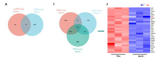 为了精准锁定NAT10调控的下游靶基因,研究人员联合分析了acRIP-seq、Ribo-seq和RNA-seq(由表观生物提供)的多组学数据。在三组数据的交集中,转录因子Ets2被鉴定为受NAT10直接调控的核心靶点。