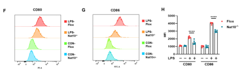 流式细胞术分析进一步证实,NAT10缺失导致巨噬细胞表面共刺激分子CD80和CD86的表达显著减少,表明巨噬细胞的促炎激活受到抑制。此外,使用NAT10的小分子抑制剂Remodelin处理也能在野生型细胞中产生类似的抗炎效果,验证了NAT10作为治疗靶点的潜力。
