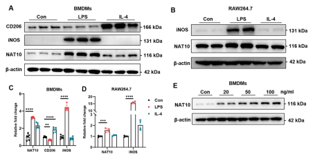 研究团队首先探究了炎症刺激对NAT10表达的影响。在骨髓来源巨噬细胞(BMDMs)和RAW264.7细胞中,利用脂多糖(LPS)或IL-4处理后发现,LPS刺激显著上调了NAT10的蛋白水平,且这种上调呈现出明显的时间依赖性和剂量依赖性。值得注意的是,尽管蛋白水平显著增加,但通过qPCR检测发现Nat10的mRNA水平在激活后并未发生显著变化,这提示NAT10的表达调控发生在转录后水平。