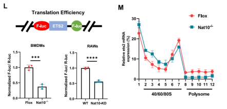 更关键的是,Polysome profiling(多核糖体分析)和双素荧光素酶报告基因实验显示,NAT10缺失导致Ets2 mRNA在多核糖体组分(翻译活跃区)中的分布显著减少,证明ac4C修饰对维持Ets2的高效翻译至关重要。