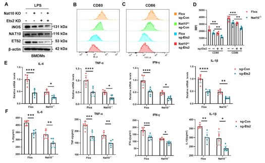 功能回复实验进一步确立了这一轴线的因果关系:在Nat10-/-巨噬细胞中通过慢病毒过表达Ets2,可以显著回补iNOS及促炎因子的表达水平,部分逆转NAT10缺失导致的抗炎表型。这些结果详尽地阐明了“NAT10-ac4C-Ets2”轴在驱动巨噬细胞炎症反应中的核心分子机制。