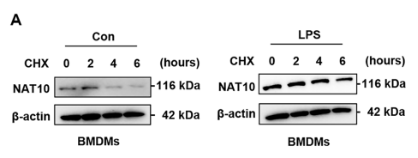 为了验证这一点,研究人员使用了蛋白合成抑制剂放线菌酮(CHX)进行追踪实验,结果显示在LPS刺激下,NAT10蛋白的半衰期显著延长,表明LPS通过抑制蛋白降解来稳定NAT10。