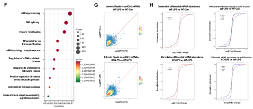 差异分析表明,NAT10敲除后,大量与炎症激活和RNA加工相关的转录本呈现低乙酰化状态。累积分布函数(CDF)分析揭示,NAT10并非通过改变整体mRNA的丰度,而是通过特异性调节关键基因的ac4C修饰水平来影响巨噬细胞的炎症表型,这为后续寻找特异性靶点提供了重要线索