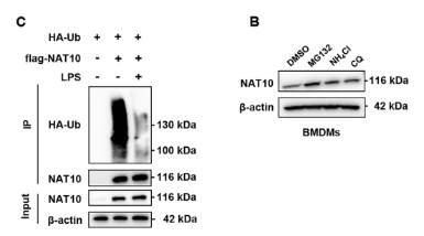 进一步的机制研究发现,NAT10的降解主要通过蛋白酶体途径进行,而非自噬或溶酶体途径。在LPS刺激下,NAT10的泛素化水平显著降低。