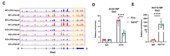 IGV可视化分析清晰地展示了NAT10敲除后Ets2 mRNA上的ac4C峰值显著降低,这一结果得到了ac4C-RIP-qPCR的验证。进一步的NAT10-RIP-qPCR和RNA pull-down实验证实,NAT10蛋白能够直接结合Ets2的mRNA转录本。