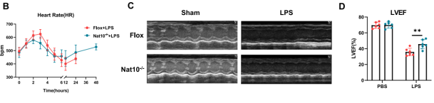 利用超声心动图对心功能进行评估,发现Nat10敲除显著改善了内毒素血症引起的心力衰竭症状,表现为左室射血分数(LVEF)、短轴缩短率(LVFS)和每搏输出量(LVSV)的显著回升,心率波动也更为平稳。