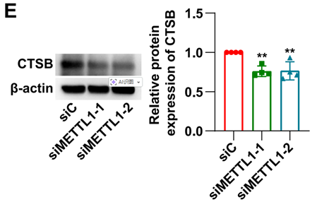 WB证实METTL1敲低降低CTSB蛋白表达,但不影响其mRNA水平和蛋白稳定性。m7G-RIP-qPCR进一步验证CTSB mRNA的m7G修饰减少。