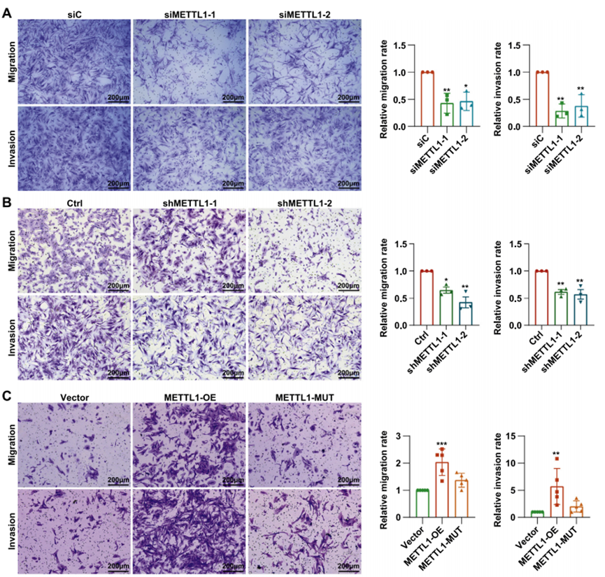 研究使用基因敲低策略,通过siRNA(A)和shRNA(B)证实METTL1缺失显著抑制RA FLS的迁移和侵袭能力。慢病毒介导的METTL1过表达增强这些表型,但催化失活的METTL1突变体无此效果(C),证明其功能依赖于甲基转移酶活性。