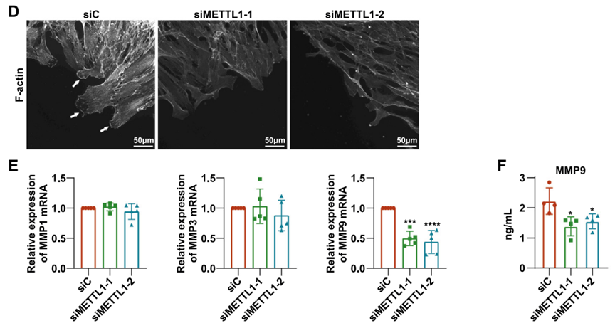 IF结果显示METTL1敲低减少细胞伪足形成(F-actin/vinculin标记)(D)。机制上,METTL1调控MMP9(基质金属蛋白酶)的表达和分泌(E、F),但不影响细胞增殖、凋亡及炎症因子产生,表明METTL1特异性调控RA FLS的侵袭性表型而非一般炎症反应。