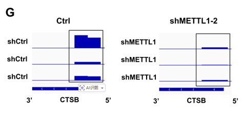 差异甲基化分析鉴定出41个m7G修饰改变的基因,其中CTSB在METTL1敲低后m7G修饰水平显著降低。