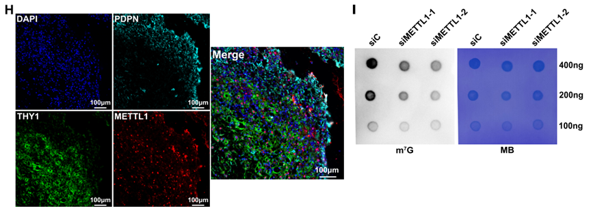 多重免疫荧光结果显示METTL1在滑膜衬层PDPN⁺THY1⁻和下衬层PDPN⁺THY1⁺ FLS中均有表达(H),而siRNA介导的METTL1敲低显著降低m7G修饰水平(I),提示METTL1是RA中m7G修饰的关键调控因子。