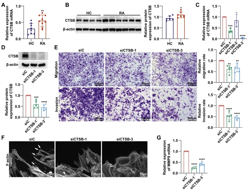 研究发现CTSB在RA FLS中高表达(A、B),且受炎症因子诱导。两种不同序列的siRNA有效敲低CTSB表达(C、D),显著抑制RA FLS迁移、侵袭能力(E)和伪足形成(F),同时降低MMP9表达(G)。