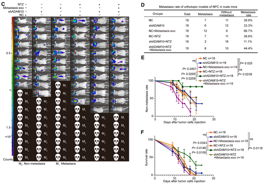 原位移植模型的系统评估揭示了联合治疗的关键价值:单独NTZ治疗或ADAM10敲低均未显著抑制肿瘤生长,但ADAM10敲低联合NTZ治疗产生了显著的协同抗肿瘤效应,表现出最高的生存率和最低的转移率。
