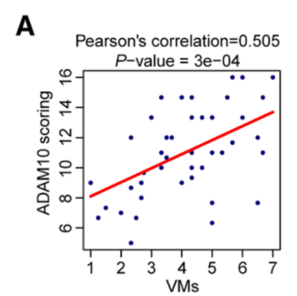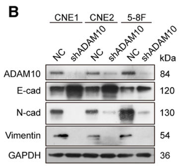 临床标本分析和功能实验系统验证了ADAM10在鼻咽癌进展中的驱动作用。免疫组化分析显示ADAM10高表达与晚期临床分期和不良预后相关,ADAM10表达水平与VMD呈显著正相关。