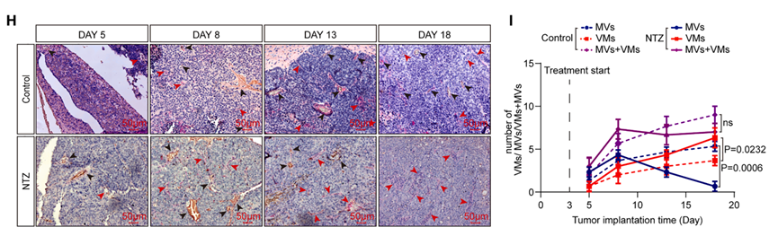 更重要的发现来自鼻咽癌原位移植小鼠模型的动态监测:尽管NTZ治疗未能显著抑制肿瘤生长或转移,但微循环系统分析发现MV密度下降的同时VM密度出现代偿性升高,使得总体血管密度保持稳定。这一现象首次在体内动态可视化了AAD治疗过程中的代偿性VM形成,为理解治疗耐药提供了直接证据,提示单纯靶向VEGF依赖性血管生成的局限性。