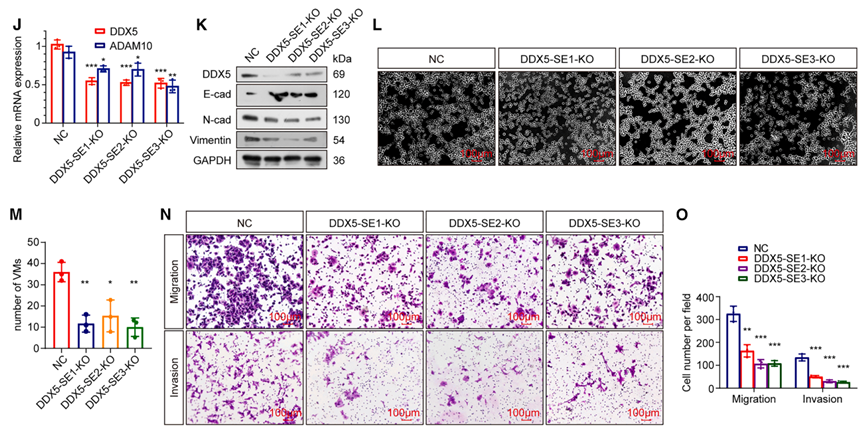 DDX5三个超级增强子关键组分任一删除均显著降低DDX5和ADAM10表达,抑制EMT、迁移、侵袭和VM形成;而E2F1超级增强子删除无明显效应,突显了DDX5超级增强子的核心调控地位。