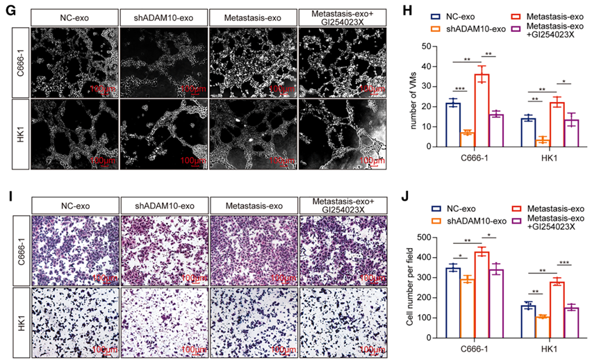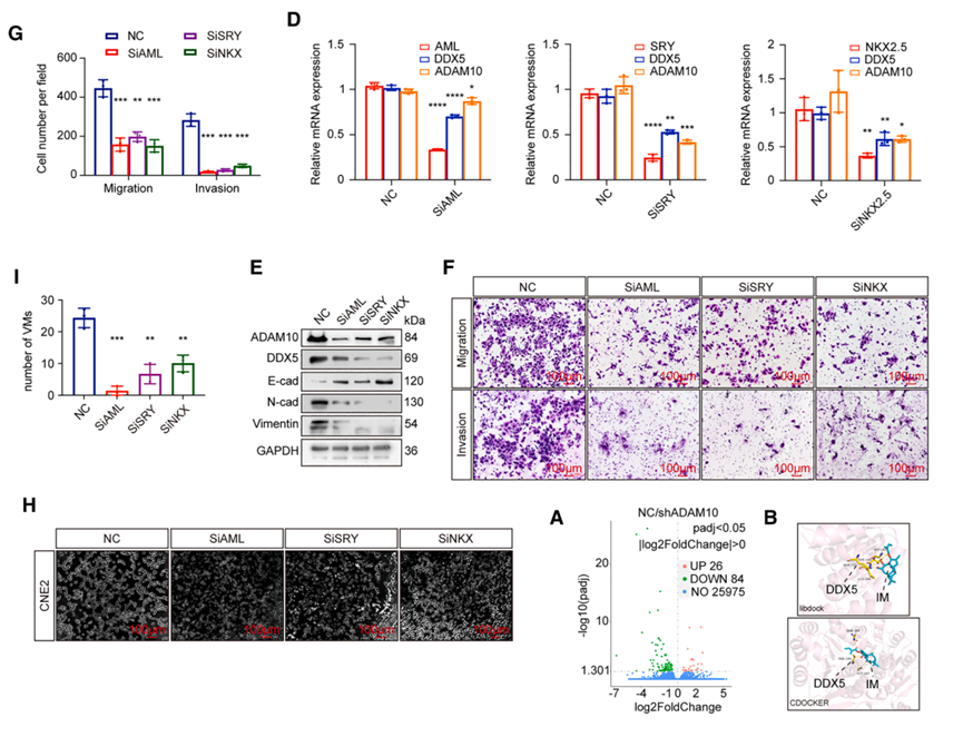体外功能研究证实ADAM10敲低显著抑制EMT进程、VM形成、迁移和侵袭能力。
