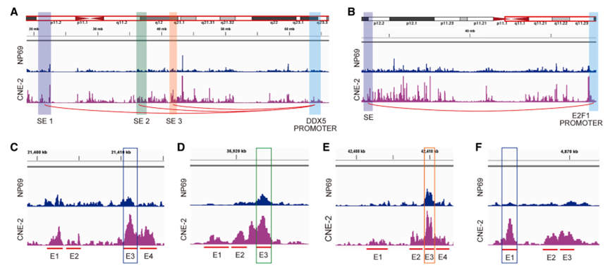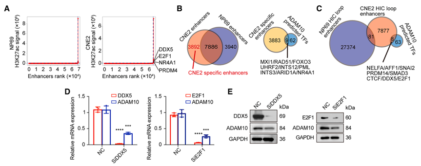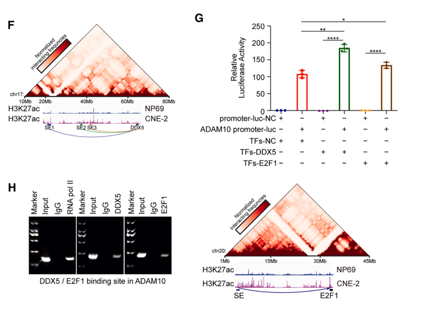 Hi-C数据揭示了CNE2特异性的长程染色质相互作用:超级增强子区域与DDX5和E2F1的启动子区域形成远程环状结构。荧光素酶报告基因和ChIP实验证实DDX5和E2F1能够结合ADAM10启动子并增强其转录活性。