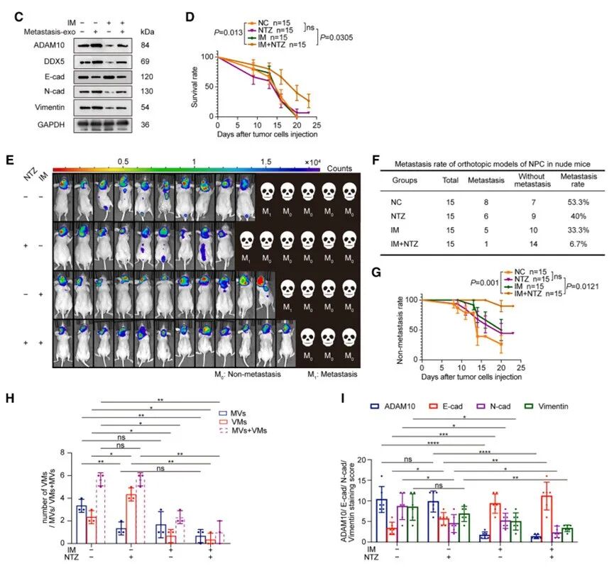 体外实验证实IM降低DDX5和ADAM10表达,抑制VM形成和迁移。在原位移植模型中,IM联合NTZ治疗显著改善生存率、降低转移率,同时抑制MVD和VMD,为AADs耐药患者提供了潜在的治疗选择。