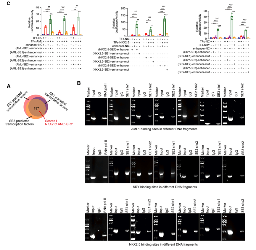转录因子筛选发现NKX2.5、AML和SRY结合评分最高,ChIP和荧光素酶实验证实它们结合DDX5超级增强子关键组分并激活转录。