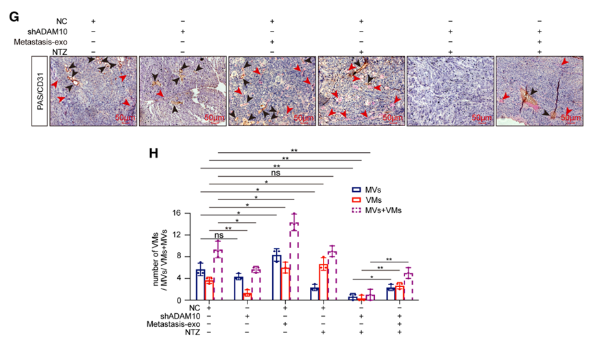 微循环系统分析阐明了作用机制:转移性外泌体同时富集MV和VM;NTZ单药降低MVD但导致VMD代偿性升高;ADAM10敲低单独使用降低VMD并适度降低MVD;而联合治疗有效抑制EMT、ADAM10表达以及MV和VM双重微循环系统,证实了通过同时靶向两种血液供应通路克服AAD耐药的可行性。