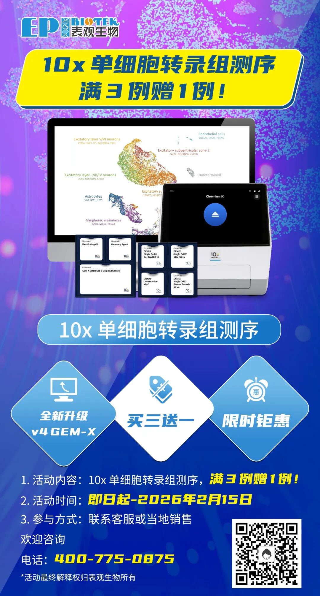表观生物始终致力于将最前沿的科研工具与最优质的服务带给广大科研工作者。为此,正式引进新一代10x单细胞测序平台”Chromium iX“,并全面搭载最新v4试剂(GEM-X)。此次战略升级,将提供更卓越的单细胞测序数据与服务,显著提升捕获效率、灵敏度与数据稳定性,为疾病机制解析、药物开发及精准医学研究提供更强大的引擎。