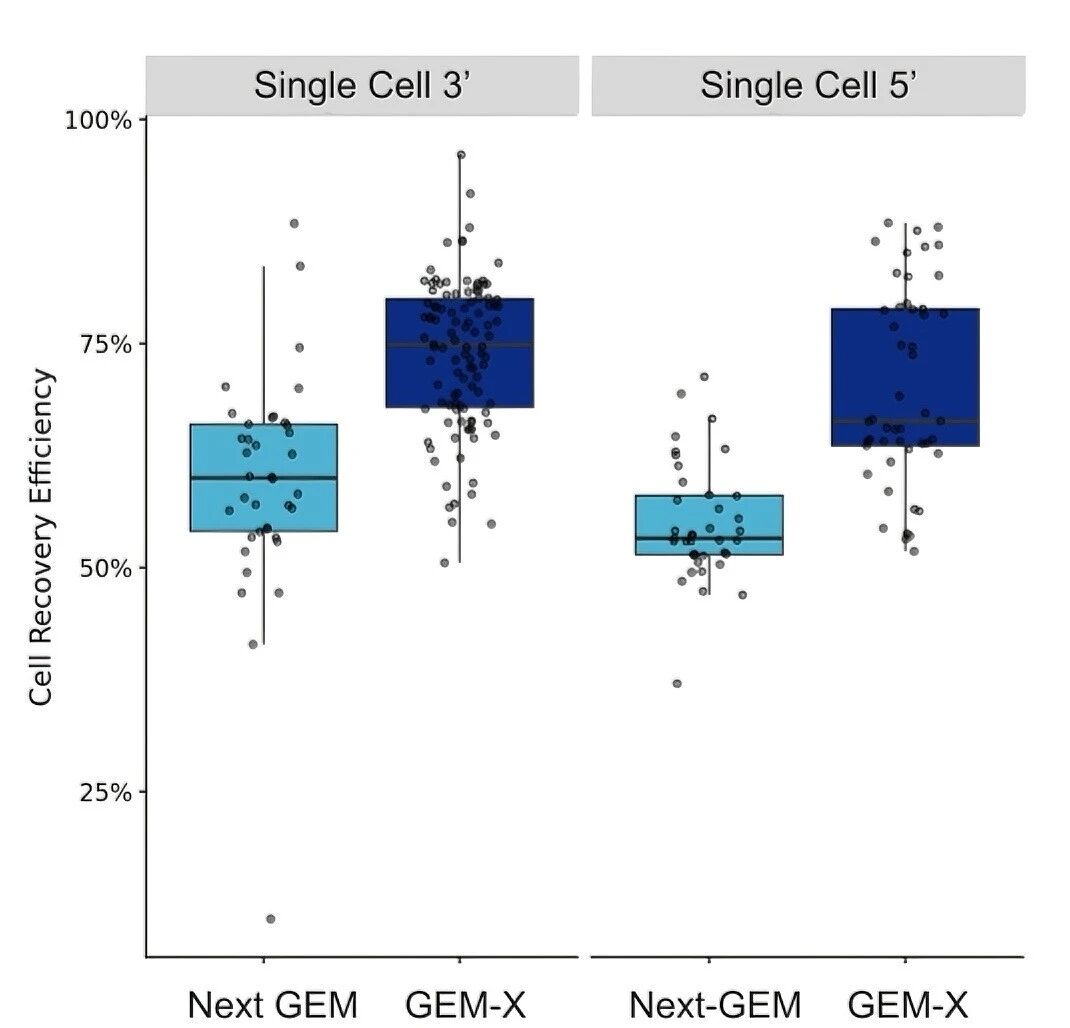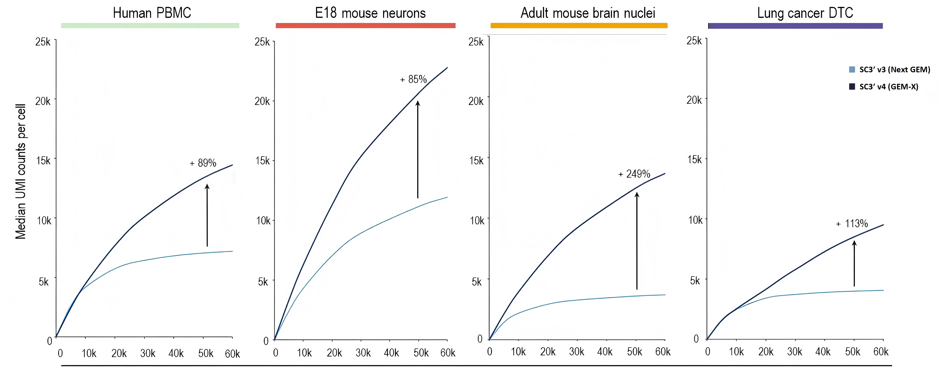 ▶v4(GEM-X)的回收率高达80%。这不仅改善了稀有细胞群的检测,还能更好地捕获珍贵样本中的细胞,包括通常只有少量细胞的样本,比如组织活检或流式分选后的细胞。